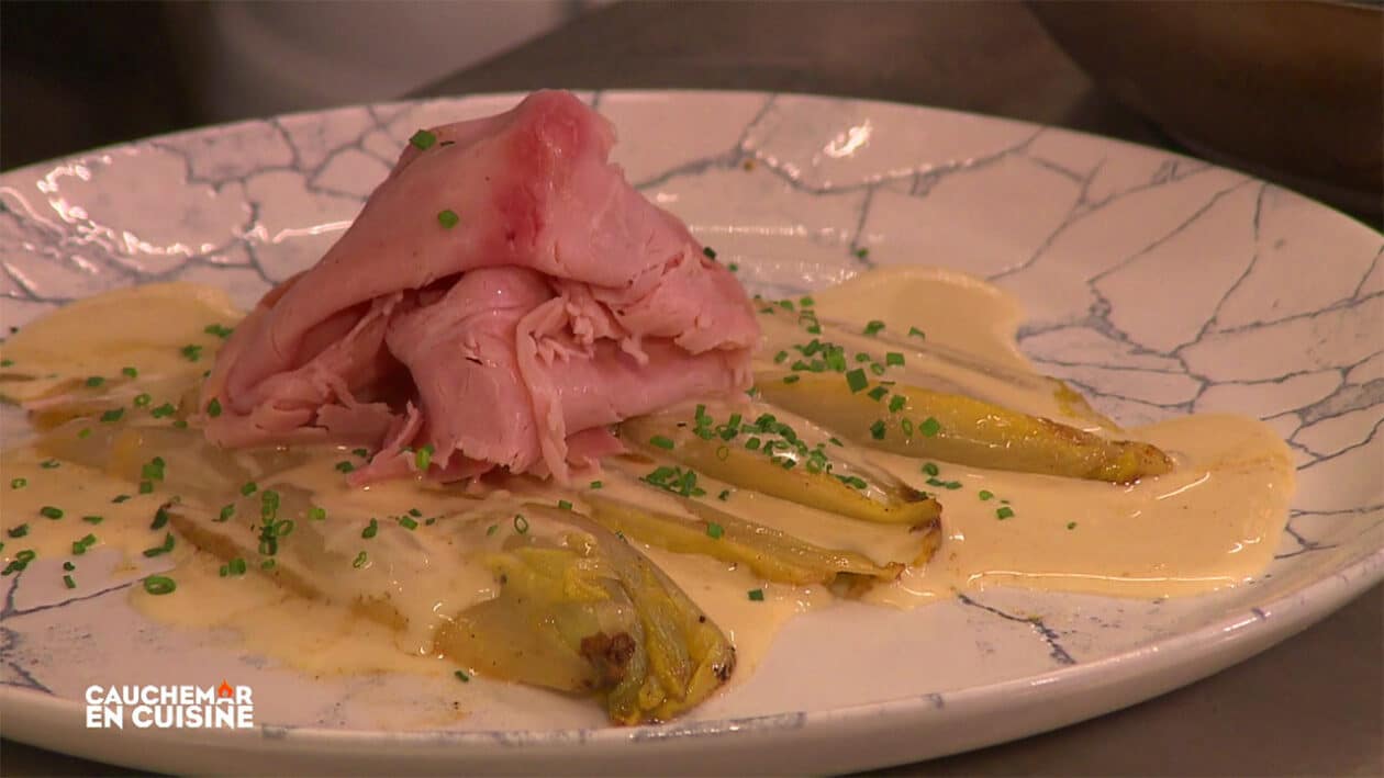 Dans l’épisode de Cauchemar en cuisine diffusé le 5 janvier sur M6, Philippe Etchebest imagine un plat mettant à l’honneur des produits locaux afin de relancer l’activité du restaurant de Romain et Betty. Le chef propose une recette réconfortante et accessible : l’endive braisée à la bière, sauce maroilles, accompagnée de jambon et d’un peu de cheddar râpé.